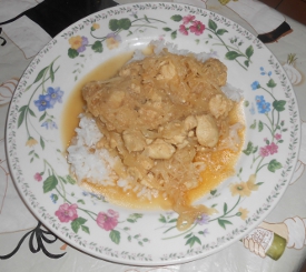 Remove onion slices and chicken cubes from large mixing bowl. (Keep lemony marinade.) Add chicken cubes, onion slices and oil to Dutch oven Sauté at high heat for 10-to-15 minutes or until onion softens and chicken is no longer pink on outside. Stir frequently. Add lemony marinade from large mixing bowl, chicken stock, bay leaf, cayenne pepper, Dijon mustard, and salt to Dutch oven. Simmer at low heat for 30 minutes-to 1 hour or until chicken is done and most of the liquid is gone. Goes well with couscous or rice.