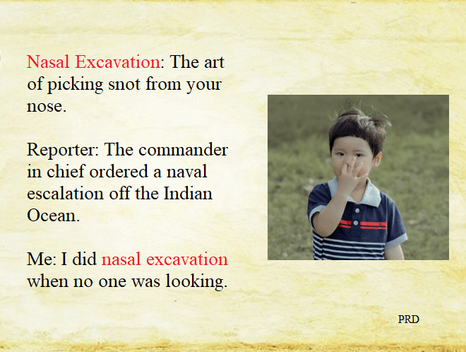 You sense that only if you could come up with a fancy, scientific phrase for nose picking, you could intimidate the clod into silence.