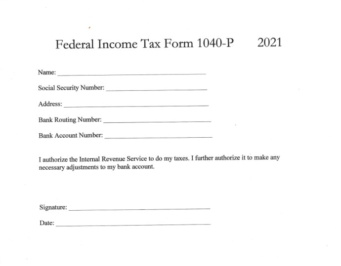 I’m glad you asked. Let the IRS do your taxes for you, They know what they want on your forms, schedules, and attachments anyway. I hereby propose a new and quite simple form to replace all the tree-devouring pages you used to submit.