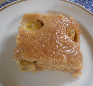 Cut each banana into 6 circles. Add water and 1¼ cups sugar to pan. Warm sugar using low-medium heat until it begin to melt. Stir enough to keep sugar from burning and clumping. Reduce heat to low and continue warming sugar until it melts completely and turns a caramel brown. Stir constantly. Pour this caramel immediately into cake pan. (Don’t let it set.) dish. Smooth with spatula.