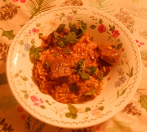 Add 1½ cups water. Bring to boil using high heat. Stir enough to prevent burning. Cover, reduce heat to low and simmer for 30 minutes or until meat is tender and most of the water has been absorbed. Stir occasionally. Add saffron. Cover, and simmer at low heat for 10 minutes. Stir occasionally. Remove cinnamon stick. Add rice to plate. Ladle spicy meat mix onto rice.