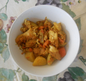 Dice garlic cloves and onions. Grate ginger. Add butter, vegetable oil and as many chicken pieces as will without touching to pan. Sauté at medium-high heat for 5 minutes or until chicken browns all over. Flip chicken enough to ensure even browning. (You might need to cook in batches.) Remove chicken and set aside. Add garlic and onion to pot. Sauté at medium-high heat for 4 minutes or until garlic and onion soften. Stir frequently. Add curry powder, ground cloves, coriander, ginger, nutmeg, salt, and turmeric. Sauté at medium heat for two minutes. Stir frequently.