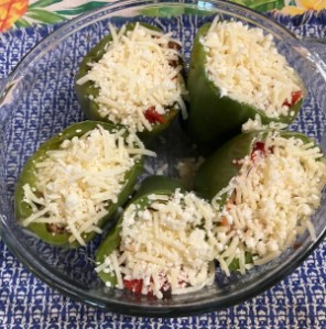 Place bell-pepper halves in a microwavable dish. (You’ll need a 3-to-4 quart dish if you want to use just one.) Add 3/4 cup water to dish. Cover and microwave on high for 7 to 8 minutes. (Microwaves vary in strength, so in general it’s best to heat for a short time, check the food and, if necessary, microwave some more.)