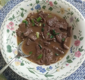 Peel ginger root. Cut ginger root into thin strips or rounds. Cut scallions into ½” long pieces. Add peanut oil and marinated steak squares to wok. Sauté at medium-high for 3 minutes or until steak squares brown. Stir enough to ensure even browning. Remove steak squares and drain on paper towels. Remove all but 1 tablespoon oil from work.