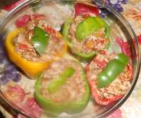 It really helps if you have a prepared green bell pepper left over from last night’s culinary extravaganza, made from the chapter on stuffed green peppers, for example. If not, cut the top off the green bell pepper and discard, or at least discard the stem. Scoop out the innards of the pepper seeds and those four vertical, soft whitish columns and throw them away. Chop up the pepper and put it in a pan. Coat the pieces with olive oil. Use extra-virgin olive oil. (That’s the most virgin you can get, unless you went through school studying economics.)