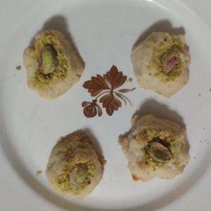 Spray cookie sheet with no-stick spray. Form dough into 1″ balls on cookie sheet. Don’t let them touch each other. Make imprint in middle of dough balls with thumb. (Hold sides of cookie as you do. This prevents the cookie from crumbling.) Bake at 400 degrees for 10 minutes or until cookies are crumbly, start to crack, and are just starting to brown around the edges. Sprinkle pistachio bits over cookies. Gently push a shelled pistachio into the imprint of each cookie. (Hold sides of cookie as you do. This prevents the cookie from crumbling.)