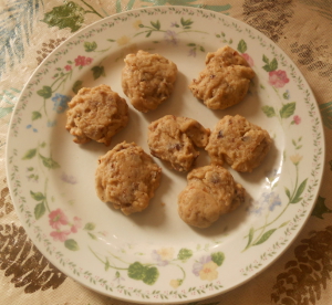 Preheat oven to 325 degrees. Rub cookie sheet with 1 tablespoon butter or spray with no-stick spray. Use a teaspoon to drop rounded balls 2″ apart onto cookie sheet. Bake at 325 degrees for 10 minutes or until cookies start to brown. (Keep an eye on the cookies. Cooking times vary with the placement and the thickness of the cookie sheet and with the oven itself.)