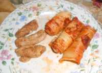 Take a tablespoon of this coating and place it near the top, narrow part of the corn husk. Roll the husk from the top until the meat stick is enclosed. Fold in the sides of the husk and finish rolling. Be sure to roll it tight. Place the resulting tamale in second large pot with the seam side down.