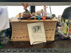 My dancing Jesus. It jiggles whenever something bumps the desk.