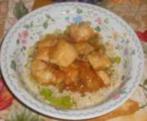 Put rice in bowl. Put cooked chicken cubes on top. Spoon sauce over everything. This is great.