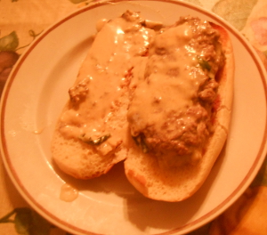 Toast French rolls. Add wine to pan. Bring to boil using high heat. Stir frequently. Add whipping cream and herbs. Stir. Bring to boil again using high heat. Stir frequently. Reduce heat to medium high. Add Camembert cheese and Dijon mustard. Stir constantly until cheese dissolves and blends into the rest of the sauce. Add beef patty to each French roll bottom. Pour sauce over beef patties. Place French roll tops on sauce-covered patties.