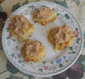 While potatoes cook and then cool, slice ½ small white onion into 4 pieces. Add this white onion and milk to pan. Simmer on low for 10 minutes. Stir frequently to keep milk from burning. Remove onion and discard. Add peanut butter and salt. Bring to boil using high heat. Stir frequently. Reduce heat to low and simmer for 5 minutes or until peanut-butter sauce, salsa de mani thickens. Spread warm salsa de mani over llapingachos.
