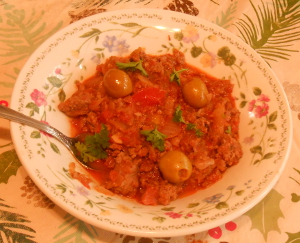 Seed and mince bell pepper. Mince garlic cloves. Dice onion and tomato. Add bell pepper, garlic, onion, olive oil, cumin, oregano, pepper, and salt to pan. Sauté at medium-high heat for 5 minutes or until onion softens. Stir frequently. Add ground beef, wine, tomatoes and tomato paste. Reduce heat to low and simmer for 10 minutes. Stir occasionally. Add olives and raisins. Simmer on low heat for 10 minutes or until raisins plump. Stir occasionally. Garnish with parsley.