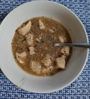 Cut chicken into 1″ cubes. Grind whole nutmegs into powder. Dice onion. Seed and mince Scotch bonnet. (BE SURE to wash your hands thoroughly after touching the Scotch bonnet or its seeds. If however you touch your face after handing the Scotch bonnet or habanero, you will remember the pain it caused for a long time.)
