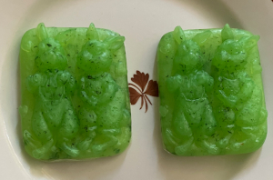 Cut glycerin base into 1″ cubes. Add glycerin base to large glass measuring cups. Melt base in 30 second intervals. Stir after every time. Add green mica powder/isopropyl mix and basil essential oil. Stir with knife until well blended. Let sit for 15 minutes. (This inhibits basil bits from settling to the bottom of the soap mold.) Add basil bits. Mix with knife until well blended.