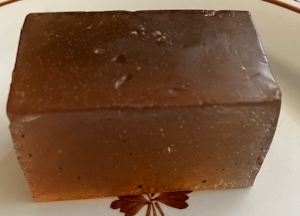 Chop glycerin base into 1″ cubes. Add glycerin to large glass measuring cups. Melt base in 30 second intervals. Stir after every time. Add yellow mica powder/ isopropyl mix and lemon essential oil. Stir with knife until well blended. Let sit for 15 minutes. (This inhibits Buddha’s hand citron from settling to the bottom of the soap mold.) Add bits of Buddha’s hand citron. Mix with knife until well blended.