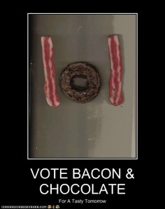 3) Party followers are a diverse lot liking all sorts of things, many of them contradictory. Sorta like Schrödinger’s cat. B&C is on the ballot on all but fifty states and has already amassed a campaign chest of $0.00. Vote Bacon & Chocolate for a tasty tomorrow.
