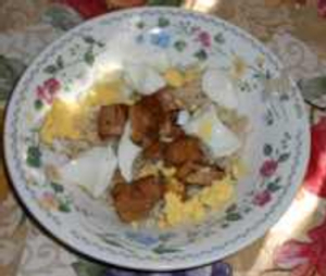 Add sauce from bowl. Cook for a few minutes or until tofu absorbs the sauce. Serve with rice. Peel eggs and crumble. Cover plate with rice. Top rice with egg. Add tofu squares.
