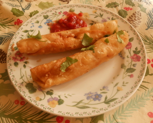 Add oil to pan. Heat oil using medium-high heat until a tiny piece of the tortillas starts to dance in the oil. Add rolled-up tortillas to pan seem-side down. Sauté at medium-high heat for 4 minutes or until tortillas turn golden brown. Turn frequently, but carefully, to ensure even browning. You will most likely need to cook in batches. Remove from heat. Drain on plate covered with paper towel. Dice cilantro. Garnish with cilantro. Goes well with salsa.