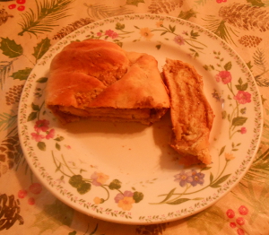 Dust large flat surface with 3 tablespoons flour. Roll out dough onto dustedt surface until it is 24″ long, 18″ wide, and ¼” thick. Ladle cooled nut filing evenly over dough. Start with 18″ side and gently roll up the dough to form a 24″ long dough long. Cut 24″-long loaf into 3 8″-long loves. Put loaves in loaf pans. Cover pans and let rise for 1 hour.