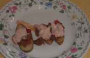 Meanwhile, back at the spuds. Dip potato slices in cold water. Sprinkle lightly with Jerk spice, sea salt, and black pepper. Place slices in a single layer on no-stick baking pan. Bake for 6 minutes then turn. Redo this baking for 6 minutes and turn until the slices are soft and lightly browned.